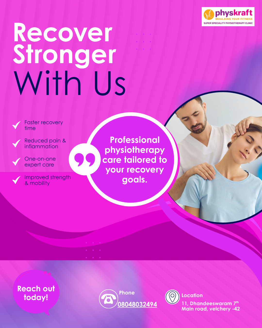 Recover Stronger with Expert Care at Physkraft! Struggling with pain, stiffness, or limited movement? Our super speciality physiotherapy clinic in Velachery offers personalized treatments to help you heal faster and move better. ✔ Faster recovery time ✔ Reduced pain & inflammation ✔ One-on-one expert care ✔ Improved strength & mobility Whether it’s neck pain, back pain, sports injury, post-surgery rehab, or joint problems — we’re here to support your recovery journey. 📍 11, Dhandeeswaram 7th Main Road, Velachery, Chennai - 42 📞 Call Now: 08048032494 Book your consultation today and take the first step towards a pain-free life!